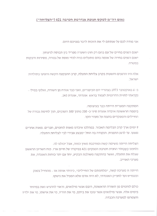 דבר ראש הממשלה ומפקד האוגדה במלחמה בטקס חנוכת האנדרטה